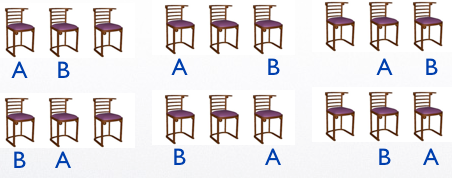 So how would you count the number of seating arrangements without listing or making the above diagram? Here’s how you can reason: The first person to sit has three choices where he wants to sit on. After having chosen the chair, the second person has only two chairs to choose from. By the multiplication principle, the two people can sit in 3 x 2 = 6 different arrangements. Notice that this is the same thing as arranging 3 persons A, B, and C in a row. So in this case you can use the permutation formula P(n,r) = n!/(n-r)!
