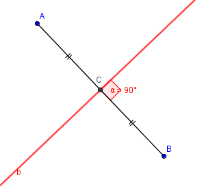 In the figure, line b is the perpendicular bisector of line segment AB at C. This implies AC=CB and the measure of the angles at C is 90 degrees.