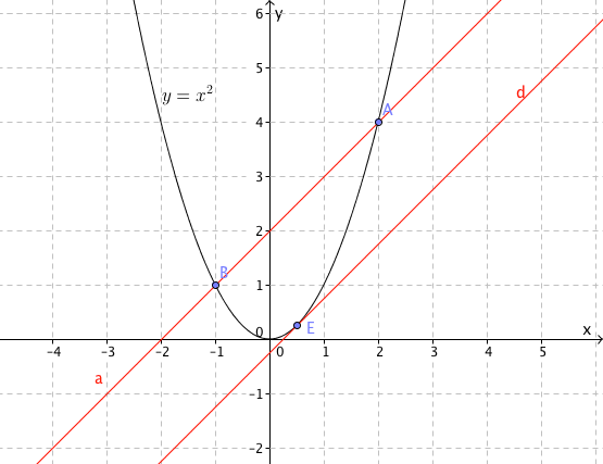 Two lines intersect the graph . The secant line intersects the graph at point A and B and the tangent line which is parallel to the secant, touches the graph at point E. You can read the coordinates of A and B from the graph but not E. What are the coordinates of E? What are the equations of the two lines?