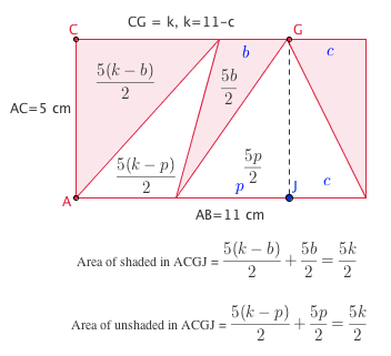 All the shaded and unshaded triangles have the same height. The total of their bases is also equal. So, the total area of the unshaded triangle is equal to the total area of the shaded triangle. That’s what the outrageous algebra below is actually saying.