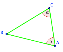 In the figure, ?ABC is an isosceles triangle. The two equal sides are AB and BC. The base angles A and B have equal measure. That is , ? = ?. The third angle, angle B  in the drawing below, is called the vertex angle.