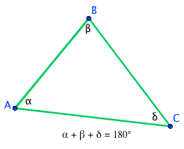 Let ?, ?, and ? be the measures of the angles of a triangle. The exterior angle of the triangle at A is equal to ? + ?; at B is ? + ? ; and at C is ? + ?.